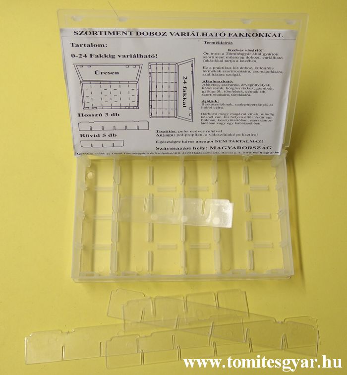 Szortiment, alkatrész tároló műanyag doboz variálható fakkokkal